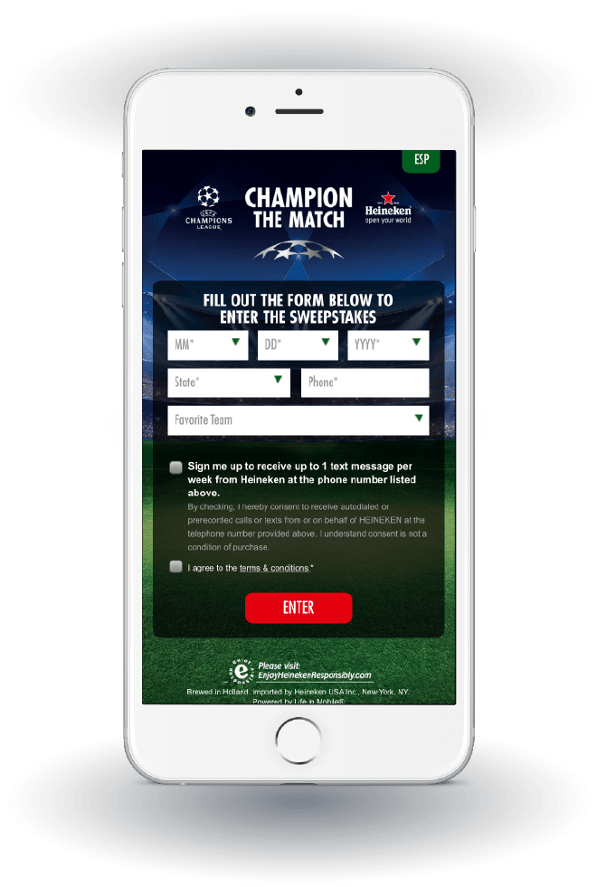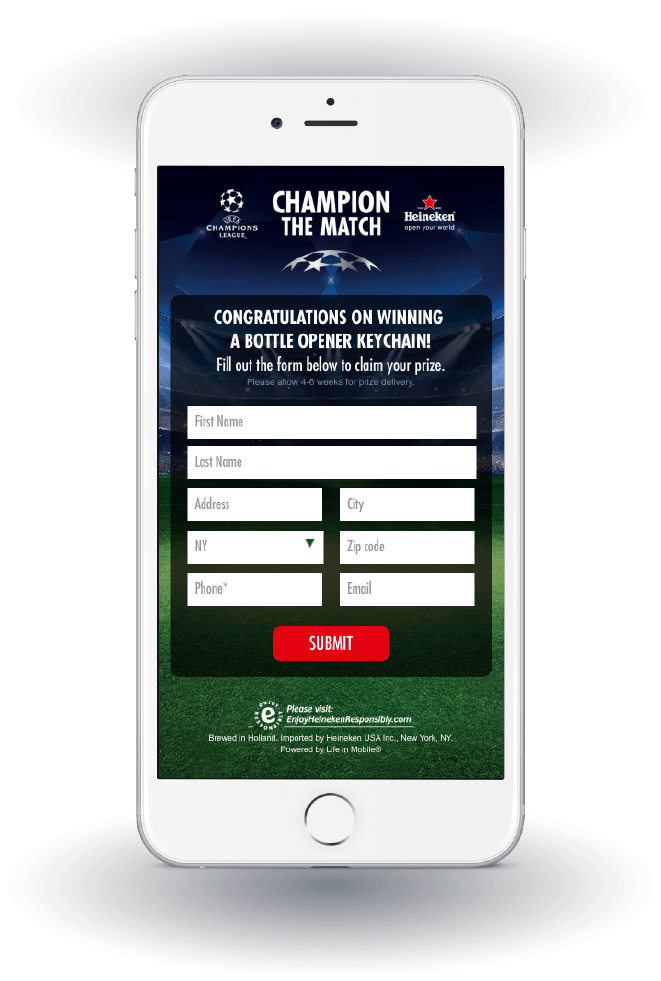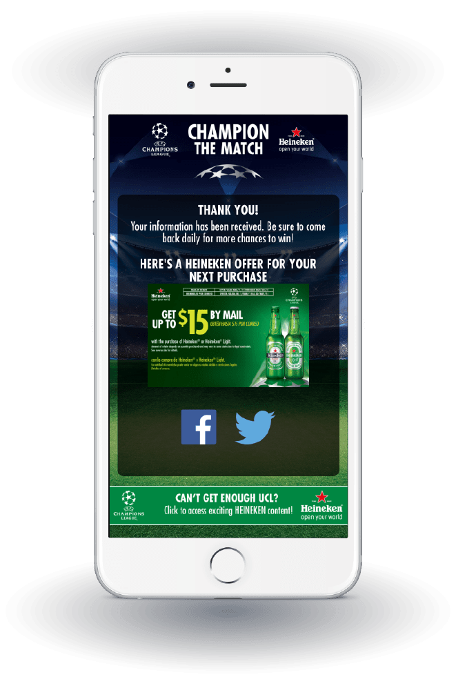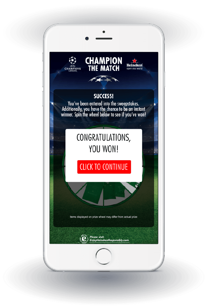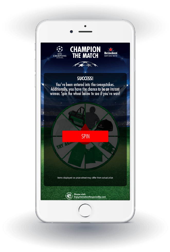 Heineken® fans received a chance of a lifetime to attend a UEFA match through a unique consumer engagement. Life in Mobile created an Instant Sweeps™, visualizing instant win prizes in a wheel to generate excitement and increase consumer participation. Social sharing amplified the program by offering additional chances to win. While engaged, a value offer was extended to drive sales as well as an opt-in to expand brand re-marketing opportunities and build a CRM.